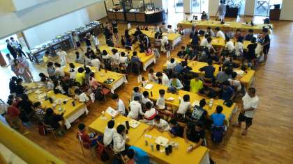 朝食後はもとぶ元気村まで歩いて「マリンスポーツ」体験。体調不良の人は「文化体験」の予定でしたが,該当者なしで全員マリンスポーツです。