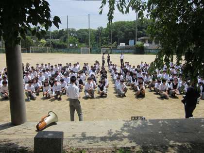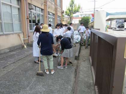 5時間目は全校あげてのクリーンアップキャンペーン。ここ2年は天候不順で中止を余儀なくされていましたが,今回は天候にも恵まれた中で実施することができました。美化保健委員長の説明を受けて動き始めます。3年生と4・5組はグラウンドの周囲,北校舎・本館・西校舎の周辺で雑草抜きと清掃にあたりました。