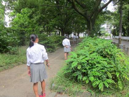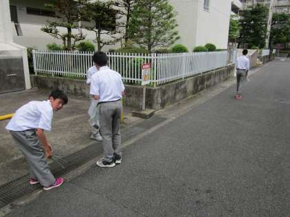 美化保健委員会では,朝8時から学校周辺の清掃活動に取り組んでいます