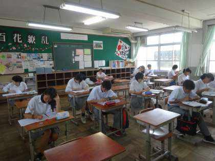 3年生は、自学自習形式で、夏休みの課題を早く仕上げにかかる生徒や、1学期の復習を含めたこれまでの総復習(→受験勉強)に取り組む生徒がいました。さすが3年生というか、6割近い生徒が参加していました。