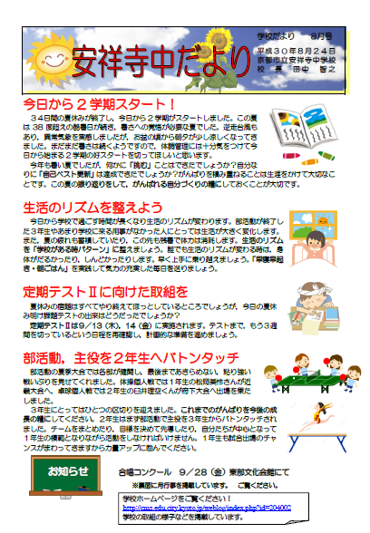 夏休みが終了し、今日から2学期がスタートしました。酷暑、大雨、台風とこれまでの概念を上回る出来事が多い夏でした。まだまだ残暑も続きますので、しっかりと睡眠をとって健康に十分留意し、生活のリズムを学校バージョンに戻してほしいと思います。生徒たちは、「今日から6時間授業なので、もう大丈夫」という様子です。
