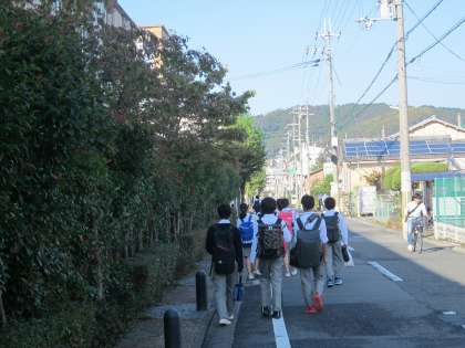 月曜日の朝の登校風景です 月初め,教職員が通学路で見守っています