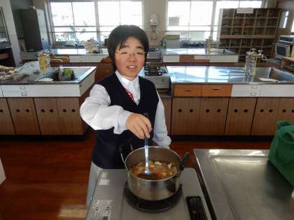 今日は豚汁をつくりました。昼食時間にいただきます。味見をした人たちの意見は「とてもおいしい」「ちょうどいい」「野菜の味が感じられる」