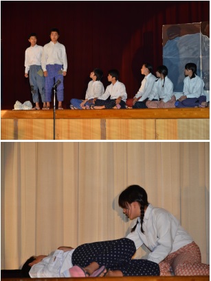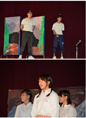 演技がとてもリアルで戦争の残酷さが伝わってきました。おどりも一体感があってすごかったです。私たちも来年沖縄に行くので戦争についてちゃんと学びたいです。そしてちゃんと後世へ戦争の辛さやひどさ,こわさをひきついでいきたいと思いました。(2年生)