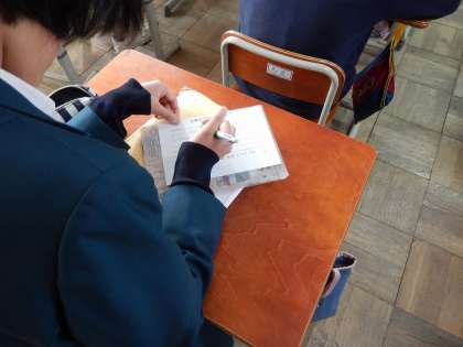 生き方探究・チャレンジ体験(職場体験)に向けて,旅行会社の社員の方から「仕事をするにあたって大切なこと」をお話しいただきました。今日,印象に残ったことについて教室で書いています。