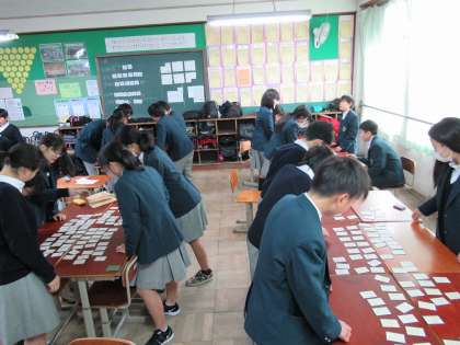 1年生は教室を使って百人一首大会を行いました。机を寄せた会場ごとに各クラスの生徒が集い、競い合いました。