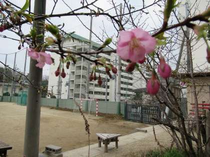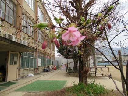 中庭から移植した早咲きの桜の木が花を咲かせています。「君たちなら大丈夫」と皆が応援しています。「サクラサク」がんばれ安祥寺中生!