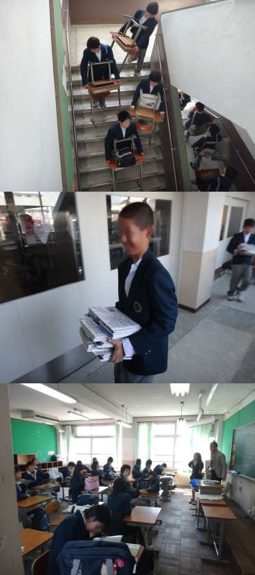 上段:新教室へ移動。机は3年間持ち上がりです。大切に。