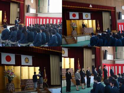 昨年と同じく晴天に恵まれ、本校39回目となる入学式が挙行され100名の新入生を迎えることができました。校門前の桜の花も満開とまではいきませんでしたが、7分咲きとなり、新しい仲間の入学を祝福してくれていたようでした。