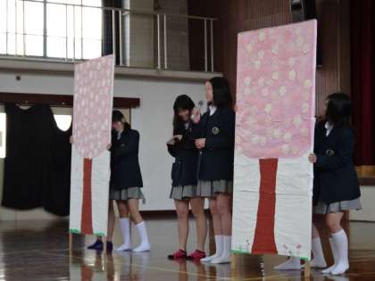 イラスト以外にも、入学式などの学校行事の看板を制作してくれています。写真の桜の看板は入学式に使ったものです。