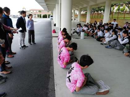 体験の披露があり、三味線や三線を弾きました。写真は三線で『ふるさと』を演奏しています。バックで先生たちが歌ってます。
