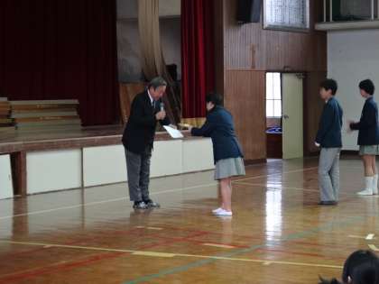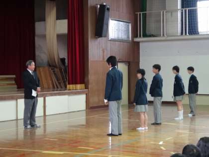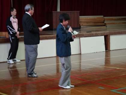 避難訓練に続いて、平成23年度前期生徒会学級役員認証式が行われました。全体の認証式では3年生の代表が学校長より激励の言葉をもらい、認証状を受け取りました。