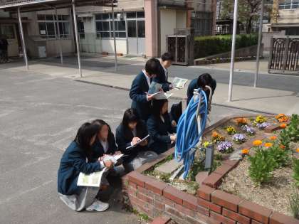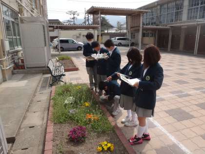 安祥寺中学校内に咲いているさまざまな植物を観察しました。ポカポカ陽気の中、一生懸命1年生が校内中の植物を探していました。