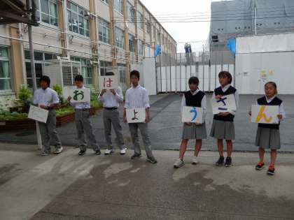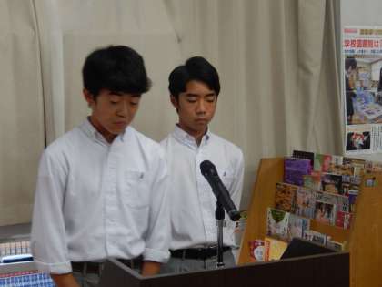 雨の終業式となりました。恒例となったテレビ放送です。写真1は朝のあいさつ運動,写真2は終業式で話す生徒会長と副会長です