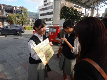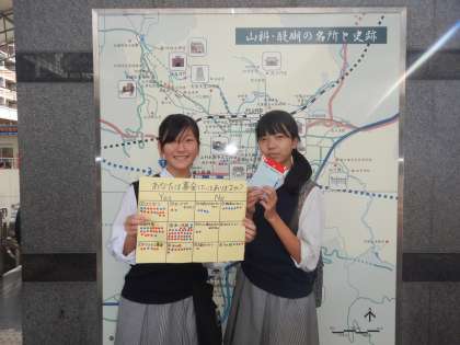 写真は「すべての人に健康と福祉を」をテーマに山科駅前でアンケート調査をした様子です。積極的に話しかけ,100名を超える人に協力していただくことができました。【6日(日)午後】