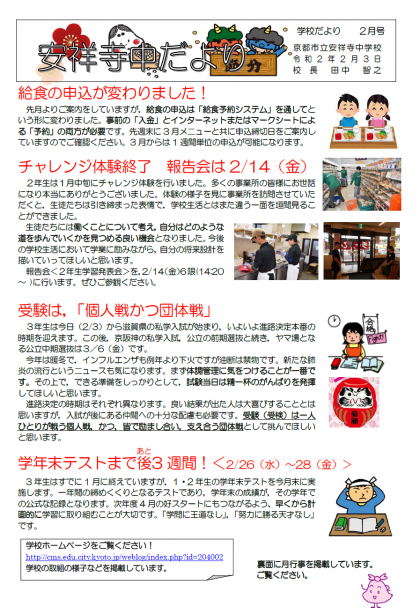 滋賀県の私学入試が今日からスタートし,3年生にとっては次の進路を決定する大切な時を迎えています。希望の花を咲かすことができるよう実力を出し切ってほしいと思います。学校だより2月号をアップしました。ご覧ください。