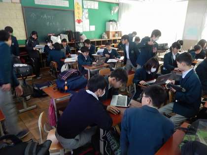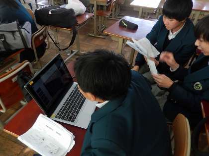 職場体験事業所ごとのグループで発表用のスライドを作成しています