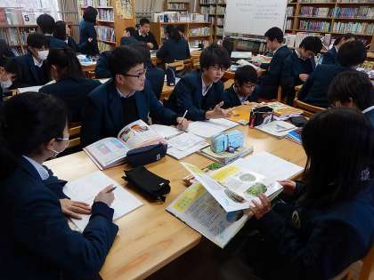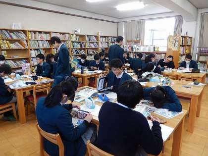 2月中旬〜3月上旬のおよそ10時間 表題の大テーマの下で各自が関心のある事柄について,課題設定→探究計画の作成→資料の収集と読み取り→考察→論文作成→プレゼンテーション作成→報告会という流れで学習活動をすすめます。写真は「資料の収集と読み取り」の終盤です。50分では足りない様子で,皆さん集中しています。