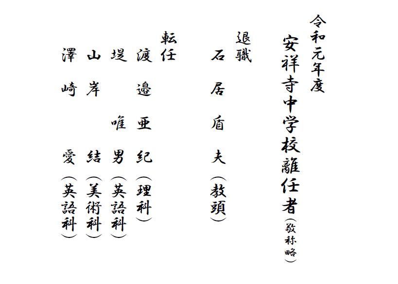今春は離任式がなく寂しい別れとなりますが,「安祥寺中の生徒たちとすてきな時間を過ごせた」という思いを胸に5名の教職員が本校を離任します。令和元年度離任者をアップしました。ご覧ください。