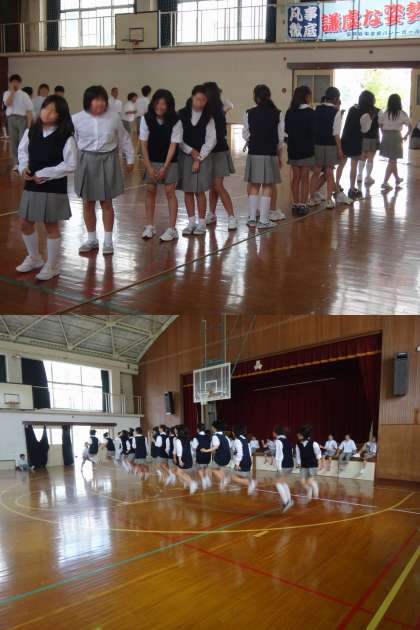 1年生ははじめてのレクレーションに真剣になり、楽しんでいました。練習ではなかなか息が合わず、何度も引っかかっていましたが、リハーサルのクラス対抗では、リハにもかかわらず、前クラス本気になり、必死になっていました。中でも3組の女子は息がぴったり合い、3分間で120回飛ぶ記録となりました。