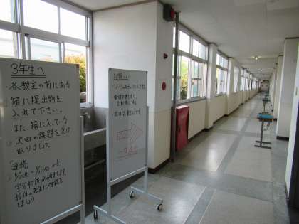 3年生の希望者を対象に,「家庭学習課題の提出」「学習の様子の聞き取りと助言」「次の学習課題の配布」という機会を設けています。随分と間隔をあけてあり,生徒の姿はまばらですが,久しぶりの登校姿が新鮮に感じられます。