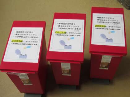 ティッシュペーパー等の専用ゴミ入れや消毒の準備をして受入準備も進めています。