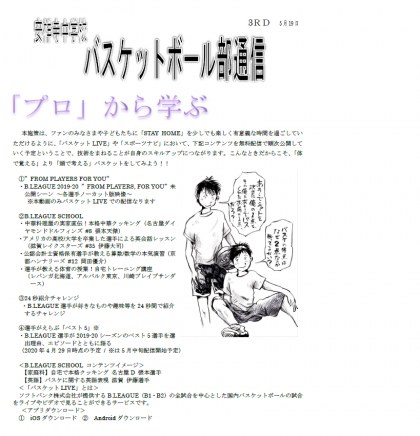 6月から段階的に学校が再開します。部活動も再開に向けて個々の準備をしておいてください。暑くなってきましたので,水分補給を怠らず,バテないように体力アップ策を考えることも大切です。