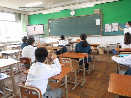 今日は,隔日登校最終日です。名簿番号偶数の生徒が,暑い中頑張っています。1年生は,アルファベットの書き順練習です。昨年の朝顔の種から芽が出て,元気に育ってます。