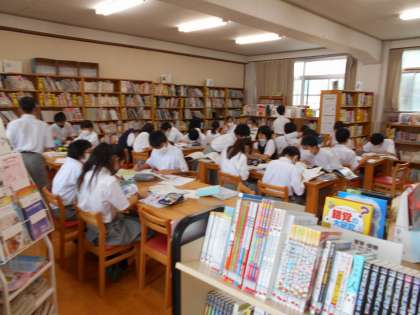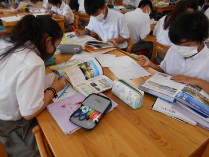 1年生の社会科の授業で,「ヨーロッパ州で気になることを調べよう」というテーマのもと,図書室で調べ学習しました。気になる国の本を自分で選び,レポートを作成し,次の時間に発表します。