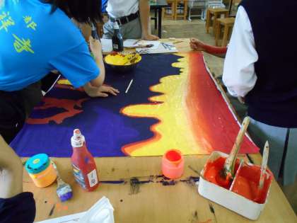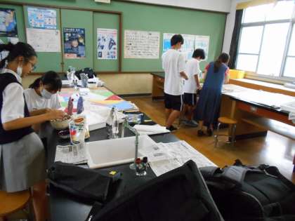 昨日から学級旗制作が始まりました。各クラスでデザインを出し合い,選出したものを,クラスの代表生徒が布に描き,着色していきます。