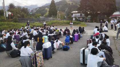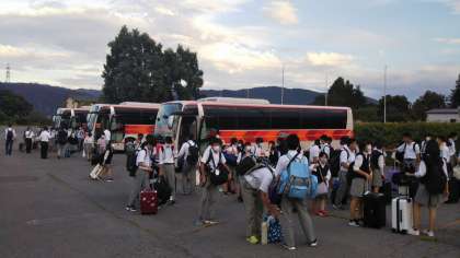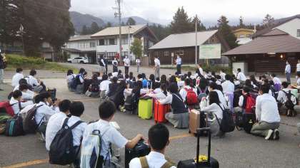 バスは,無事に白馬村に到着しました。各ペンションのオーナーさんに集まっていただき,生徒主催の入村式を行いました。ペンション移動し,夕食です。
