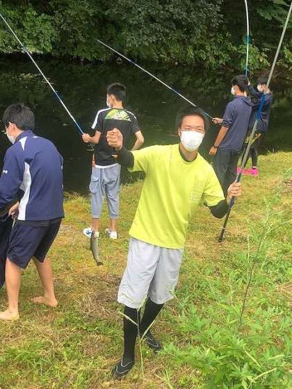 修学旅行2日目午前は,フィッシング・シャワーウォーキング・マウンテンバイクの3種類から,生徒がそれぞれ希望した自然体験を行います。フィッシング(釣り)体験では,竿の操り方を練習し,実践に臨みました。さて,釣果のほどは。