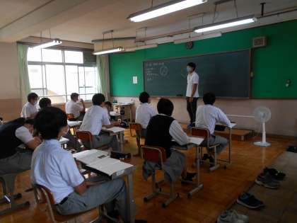 9月17日・18日に定期テストがあります。本日より1週間前に入り,部活動停止になります。(ただし,公式戦直前の部活動は除く。)3年生にとっては,進路決定に向けた大事なテストになります。写真は,3年生の授業風景です。