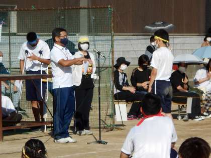 体育大会午後の部で,1・3年生の全員リレーや3年生の100M走,学級対抗混合リレーがありました。各学年の総合優勝は1年1組,2年2・4組,3年1組でで,色別対抗の優勝は黄組でした。多くの保護者の皆様にご参観いただき,ありがとうございました。