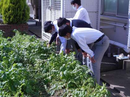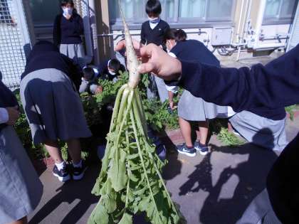 技術の栽培の授業で,9月に種をまいた大根が大きく育ち,さらに大きくおいしくなるための間引きを行うまでになりました。間引いた大根,もったいないですが仕方ないです。