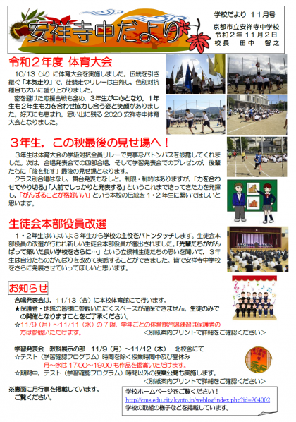 11月に入りました。先月下旬には,進路相談会(3年生)や教育相談(1・2年生)で「仮成績」も提示し,2学期後半の目標を確認しました。良い締めくくりができるよう,一歩一歩前進していきましょう。