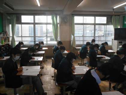 定期テスト2日目。2年生は英語のテストから始まりました。リスニング(聞き取り)もあり,耳をそばだてていました。