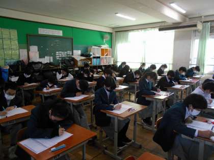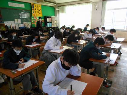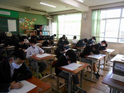 定期テスト3日目最終日です。1年生は,1時間目数学のテストです。解き方を思い出しながら,一生懸命取り組んでいます。