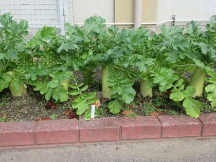 正門の桜は落葉が進みましたが,つぼみはふくらみを増し,春に花を咲かせる準備がうかがえます。中庭で栽培学習中の大根は,寒さの中,大きく育っています。私たちも一歩ずつ歩みを進め,新たな年を迎えたいものです。