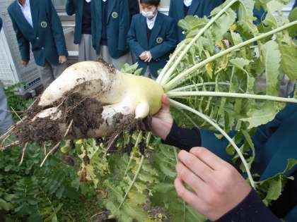 技術の時間に種から大事に育ててきた大根の収穫を行いました。水やりをしたり,間引きをしたりと,手塩にかけた大根が大きく大きく育ちました。さぞ美味しいでしょう。