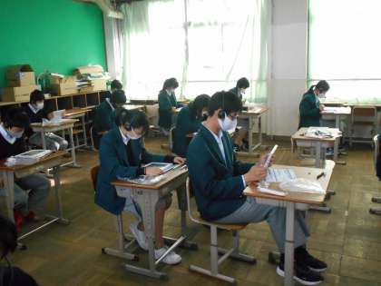 2年生で英語4技能(読む・書く・聞く・話す)の検定を行いました。生徒たちは,タブレットを使って英語を話す場面にドキドキしながらチャレンジしていました。