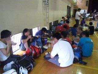 静原小学校の体育館にて昼食を取っています。