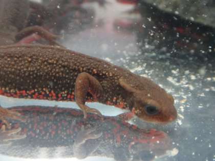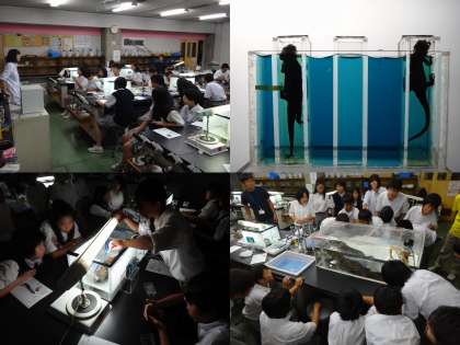 アカハライモリを双眼実態顕微鏡で観察したり、歩き方や泳ぎ方、呼吸の仕方などを観察しました。最後にはアカハライモリと同じ、世界最大の両生類である特別天然記念物オオサンショウウオ(京大から借りているそうです)のエサやりも観察しました。