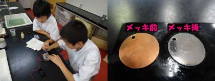 生活の中に多く使われているめっき技術について学習し、いろいろな物質を使って実際に3種類のめっき(置換めっき、電気めっき、触媒めっき)を行いました。