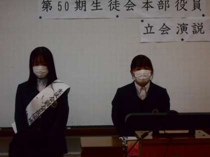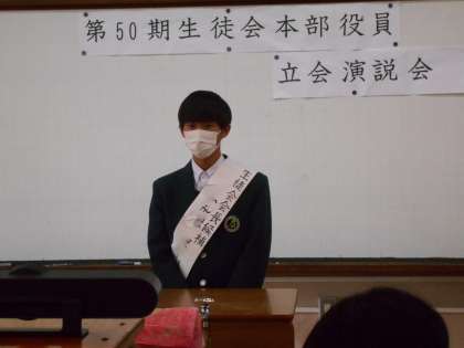 第50期生徒会本部役員選挙に16名の立候補があり,立会演説会と選挙が行われました。立候補者は,「学校をこうしたい」とそれぞれの熱い思いを力強く訴えかけていました。
