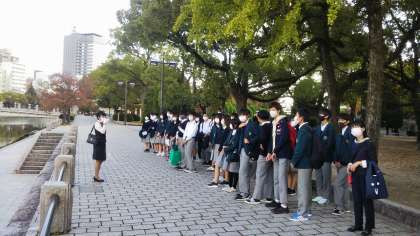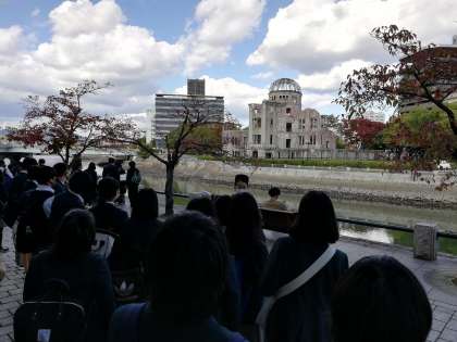 対岸から原爆ドームを眺め,その説明に聞き入っていました。