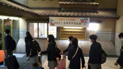 フェリーから下船し,山手にしばらく歩き,予定より少し早く宿泊地に到着しました。入口で,一人ずつ検温し,自分の荷物をもって各部屋に入りました。この後は,夕食・入浴・レクリエーションと続きます。レクリエーションは20時以降になりますので,明日にでもホームページにアップさせていただきます。