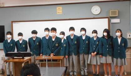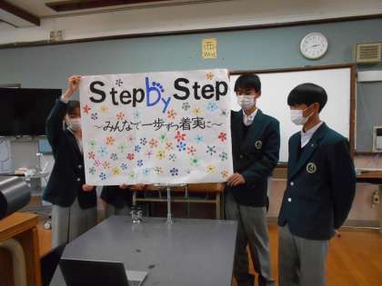 旧生徒会本部役員の皆さん,お疲れ様でした。第50期生徒会のスローガンは「SETP by SETP」です。一歩ずつ着実に進んで,自分の道を切り拓いていくという思いが込められています。