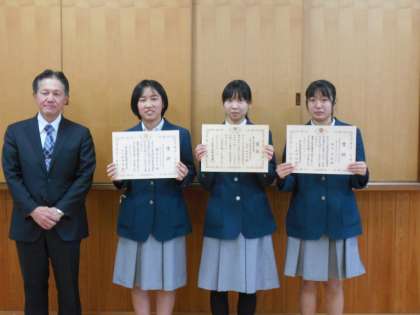 全国納税貯蓄組合連合会ならびに国税庁主催の「税についての作文」に応募した3年生から,山中みさとさんが「東山税務署長賞」,勝矢まなみさんが「東山納税貯蓄組合連合会会長賞」,岡田莉央さんが「東山納税貯蓄組合連合会優秀賞」に選出され,石田東山税務署長様から表彰ならびにメダルを授与されました。