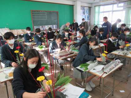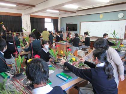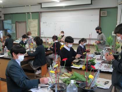 東福寺未生流の井田先生ら講師の先生方から手ほどきをうけぎこちない手つきながらも自分の感性を盛り込んだ作品づくりに励みました。